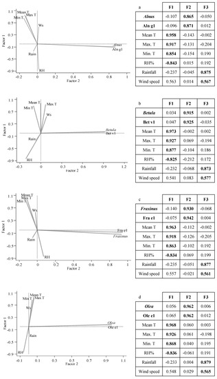 Furthermore, a principal component analysis (PCFA) was conducted with the aim to better understand the meteorological influence in the pollen and allergen airborne concentrations as PCFA showed the influence of all consider weather variables as a whole. The purpose of the analysis is to obtain a small number of linear combinations of the selected variables which account for most of the variability in the data. Three components have been extracted for each taxon, since they had eigenvalues greater than or equal to 1.0 and they account for together between 79% and 84% of the variability in the original data. The three PCs were correlated as follows: Component 1 temperatures and relative humidity, Component 2 pollen and allergen values and Component 3 wind speed and rainfall (Figure 3). To better understand the relationship between pollen/allergens and meteorological parameters, a plot with the PC explaining the higher variability PC1 vs. PC2 was conducted (Figure 3). The results obtained reinforced the correlation analysis results registering a high positive degree of association between the pollen counts and the allergen levels (Figure 3).