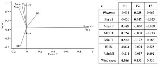 Plot and Factors of principal components and factor analysis (PCFA) for each taxon, meteorological parameters: Mean, Maximum and Minimum temperatures (Mean T, Maximum T and Minimum T), Relative humidity (RH), Rainfall (Rain) and Wind speed (Ws) (a-Fraxinus. b-Alnus. c-Platanus. d-Betula and e-Olea).