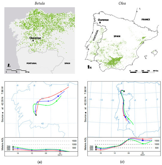 Furthermore, a back-trajectory analysis was conducted to explain the timing discrepancies observed between the pollen and allergen peaks for all taxa. Only special situations were observed in the case of Betula and Olea (Figure 4). The analysis led us to detect that the second pollen and allergen Betula peaks were coincident with air masses from the high mountainous areas around the city of Ourense. In the case of Olea and Ole e 1, the pollen and allergen maximum peaks were influenced by continental air masses coming from the North of Portugal (Figure 4).