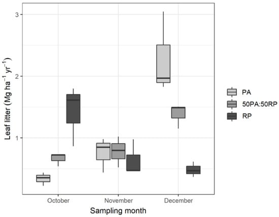 Monthly contribution (mg ha−1 yr−1) of the leaf litter in the P. alba (PA) and R. pseudoacacia (RP) monocultures, and the 50PA:50RP mixture.