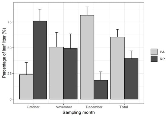 Percentage contribution of P. alba (PA) and R. pseudoacacia (RP) to the total leaf litter of the 50PA:50RP mixture.
