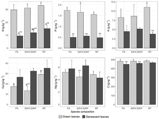 The mean C values in green and senescent leaves were not significantly different between plots (p-value = 0.863 and p-value = 0.136, respectively) (Figure 3), nor were there significant differences between green and senescent leaves in the R. pseudoacacia monoculture (p-value = 0.0122 for PA; p-value = 0.0007 for 50PA:50RP and p-value = 0.0659 for RP). These values were very similar to those described for senescent poplar leaves by Cotrufo et al. [] of around 435 g kg−1 or to the C values  in green leaves of R. pseudoacacia reported by Cao and Chen [] of around 480 g kg−1. Leaves account for an important fraction soil C contribution [].