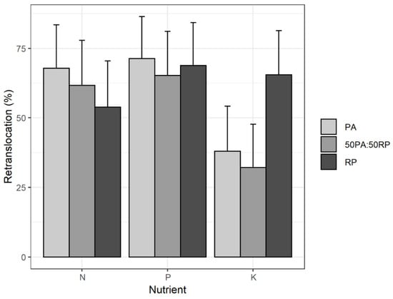 Aerts [] states that for deciduous species in general, efficient retranslocation ranges from 40 to 75% in the case of N and from 30 to 70% for P. Hence, the rates of N-re and P-re in the three studied plots (monocultures and 50PA:50RP mixture) would be within those ranges or proximate to them. However, in the case of R. pseudoacacia, lower NPK retranslocation values (45, 45 and 60% respectively) were reported by Ozbucak et al. []. According to Salehi et al. [], NPK in poplar hybrids ranges were 12–19%, 32–40% and 21–24%, respectively, while Das and Chaturvedi [] detected higher limits for P. deltoides of around 52–54%, 40–46% and 46–47% for NPK, respectively. In the present study, the retranslocation percentage in P. alba was higher than 50% for all nutrients except for K.