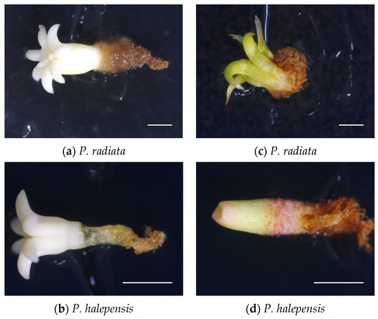 The germination mechanism of cotyledonary somatic embryos is complex and an alternative in this case are studies with post-maturation treatments [36], because in P. halepensis (22%, 30%, 24%, and 34% for 23, 40, 50, and 60 °C, respectively) we observed a low percentage rate of germination compared to P. radiata (44%, 51%, 46%, and 51% for 23, 40, 50, and 60 °C, respectively).
