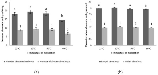 Somatic embryos obtained per 0.08 g of embryonal masses submitted in different maturation temperatures (23, 40, 50, and 60 °C, after 12 weeks, 90, 30, 5 min, respectively). (a) Number of normal and abnormal somatic embryos; (b) the length and width of normal embryos from Pinus halepensis Mill. Different letters or numbers show significant differences according to the Tukey–Kramer test (p ≤ 0.05).
