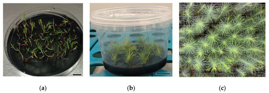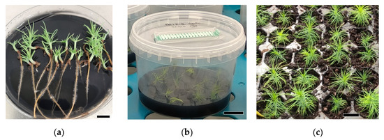 Germination and acclimatization of somatic plantlets from P. radiata obtained from different embryogenic cell lines and maturation temperatures. (a) Plantlets after two months in germination medium, bar = 1 cm; (b) plantlets after three months cultivated in the germination medium, bar = 2 cm; (c) plantlets derived from normal cotyledonary somatic embryos growing in the greenhouse, bar = 2 cm.
