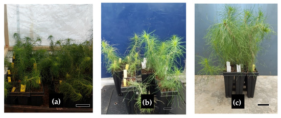 Germination and acclimatization of somatic plantlets from Pinus halepensis Mill. obtained from different embryogenic cell lines and maturation temperatures. (a) Somatic plantlets after two months in germination medium, bar = 1 cm; (b) plantlets cultivated after three months in the germination medium, bar = 2 cm; (c) plantlets derived from normal cotyledonary somatic embryos growing in the greenhouse, bar = 5 cm.