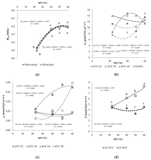 A decrease in water potential was observed in plants from ECLs matured in MTs of 23 °C (Figure 8a). Similarly, the same pattern of decline was observed when assessing water potential after water and heat stress conditions, which in turn was less than the initial water potential (Figure 8a). For this characteristic, the data fit the model with a determination coefficient above 98% (R2 = 0.98).