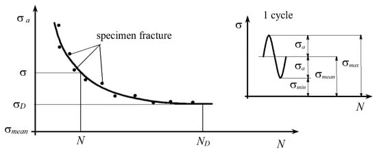 When designing parts and structures, various physical models must be taken into account, which can lead to damage, failure or collapse of a part or an entire structure. The collapse of a part can be caused by a sudden overload (resulting in an impact fracture) or by a regular or continuous change of stress at lower levels under the influence of dynamic stress, which after a certain time leads to fatigue and, consequently, permanent fracture. Repeated loading causes permanent deformation, cracks and fractures even at stresses of lower levels, which would not lead to permanent deformation under static loads. Due to the occurrence of fatigue, the strength of the material under dynamic load is 20 to 60% lower than under static load []. The dynamic strength depends on the type of load and the number of load oscillations. It is determined experimentally by dynamic testing of specimens in special test rigs for fatigue tests. The test specimens are subjected to dynamic loads of a certain intensity until a crack or a fracture occurs. For a given series of test specimens, the mean stress is a constant σmean = const., and the amplitude stress σA is gradually reduced with each subsequent test specimen, recording the number of load cycles N at which each test specimen was permanently fractured. The test results are shown in σ–N (S–N) diagrams in the form of the number of load cycles N until the occurrence of a crack or a fracture in a curve of the dynamic strength of the material (S–N curve, Woehler curve) (Figure 1). The constant value, to which the curve asymptotically approaches, represents the maximum nominal stress under a periodically changing load that the test piece can withstand for an unlimited number of oscillations without fracture; it is called the permanent dynamic strength of the material.