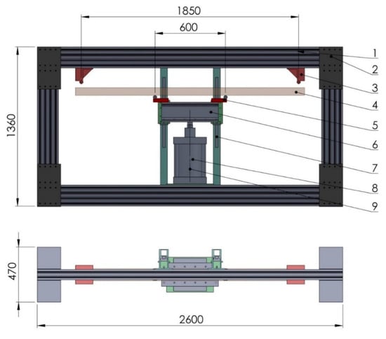 The basic guideline for the selection and design of the test rig construction was a large and fast flexibility depending on the shape and size of the test specimen. A composite drawing of the test rig structure is shown in Figure 3.