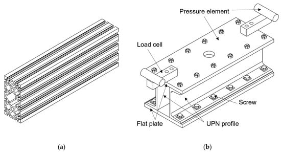 The press element consists of two UPN 140 profiles (Figure 4b). They are bolted to flat steel plates of 200 × 15 mm. The bolted construction enables the replacement and reworking of components from the assembly and operation of the device; it also enables the replacement of parts due to possible damage. The two FTKL 2000 load cells are bolted on the top side. The pneumatic cylinder is screwed on the bottom side via the interface (Figure 3). Due to the possibility of an asymmetrical breakage and the resulting overload of the load cell and the pneumatic cylinder, the pressure element is connected to the ball linear guideway Hiwin HGW 25 HA (Figure 3).