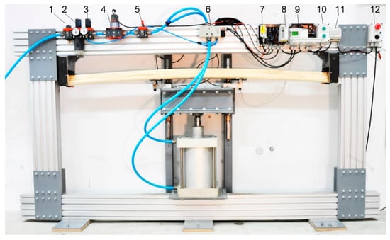 It is known from Section 2.1 that the required force is 35 kN, which summarizes the actuator selection options. To perform the cyclically pulsating load (R = 0), a pneumatic system was used consisting of a compressed air preparation unit, a control unit, a digital air regulator, two valves and a cylinder (Figure 5). In addition to the above elements, there are also switches for pressure overload and air cut-off, as well as a regulator for the supporting pressure required to operate the valves (Figure 5). The entire pneumatic system is designed for working pressures of up to 10 bar.