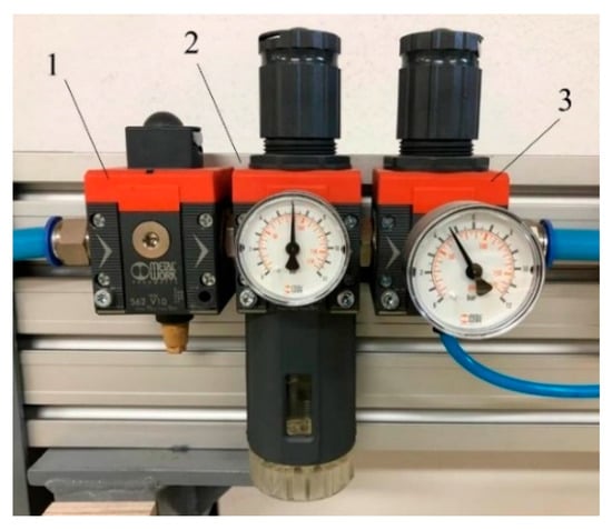The pressure in the entire pneumatic system is adjusted with the main regulator. The actual air supply to which the test unit is connected can produce a maximum pressure of 7 bar. An additional regulator is included in the part of the preparation group that only serves to provide the supporting pressure for the valve control (Figure 6). There is also a manual shut-off valve at the inlet before the regulators, which allows the entire system to be disconnected from the air supply and is used for shutdowns or non-operational and maintenance work on the test rig (Figure 6).