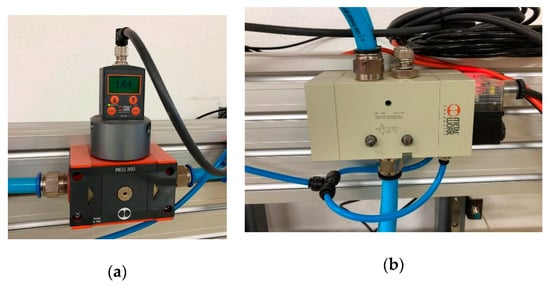 In order to precisely determine the air pressure and to maintain its value independent of fluctuations in the supply system (taking into account that the supply pressure must not be below the set point), the device is additionally equipped with a Regtronic 300 digital pressure regulator, which precisely monitors the pressure and readjusts it if necessary (Figure 7a). The regulator has a screen on the front panel, which displays the actual pressure, as well as buttons for setting the desired pressure and other pressure control parameters. It is also equipped with an analog input and output, digital communication RS 232 and an alarm output.