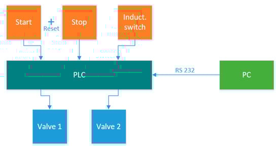 The control system of the fatigue test rig ensures the cyclic loading of the test specimen with the possibility to change the test dynamics; it counts the number of loads and stops the test in case of failure of the test specimen (inductive switch). For this purpose, a programmable logic controller (PLC) can be used. The block diagram of the control system of the fatigue test rig is shown in Figure 8.