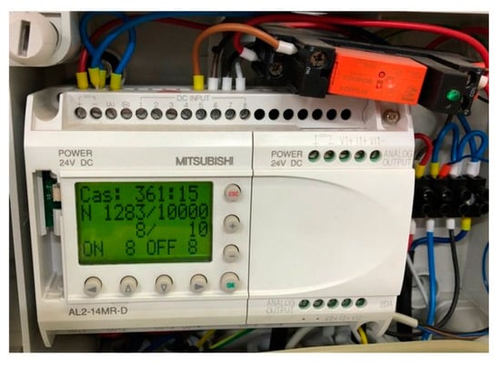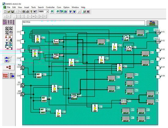 This controller has eight digital inputs and six relay outputs. The controller has an LCD screen (Figure 9) on the front panel where you can display various parameters and data. The PLC has been programmed so that the loading and unloading time can be adjusted with the buttons next to the screen (Figure 9). The main programming of the PLC is done by the PC program Alpha Programming (Figure 10).