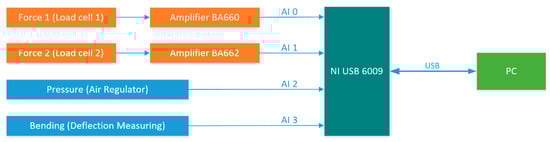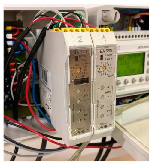 The load cells were connected to a measurement amplifier BA 662/660 (A.S.T.—Angewandte System Technik GmbH, Dresden, Germany), which ensures sufficient amplification and filtering of the load cell measurement signal (Figure 15).