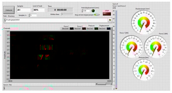 For recording the measured values of the sensors, the measuring interface of the company, National Instruments, with the marking NI USB 6009 (Figure 11) was used, and in the software package, LabView, a special software interface (Figure 12) was developed, which allows one to display and record the measurements in the desired binary file (TDMS) and to stop the measurements if the test specimen collapses. Due to the complexity and the large amount of data, the analysis of the measurement results is performed separately.