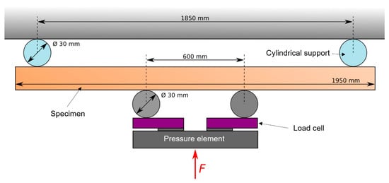 The fatigue test on a specimen works based on the principle of four-point bending, whereby force is applied to the specimen by a compression element via two rollers with a diameter of 30 mm at a distance of 600 mm from each other (Figure 13). The specimen is supported at the ends by two fixed cylindrical elements with identical dimensions at a distance of 1850 mm.