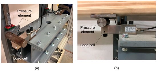 (a) Pressure element with load cells; (b) the side profile of the load cell during fatigue of a wood specimen.