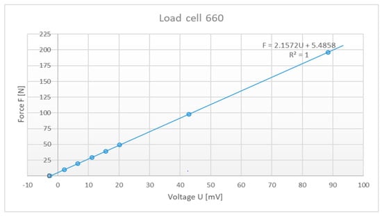 The calibration of the built-in load cells was performed by placing known masses of weights on the load cells and reading the values of the output voltages from the amplifier. Due to the limited set of weights (2 × 1 kg, 2 × 2 kg and 2 × 10 kg) the measurements were only carried out in the lower force range. For load cell 1 connected to amplifier 660, the dependence between the voltage U in millivolts and the force F in Newton (Figure 16) was determined according to the following Equation (1):