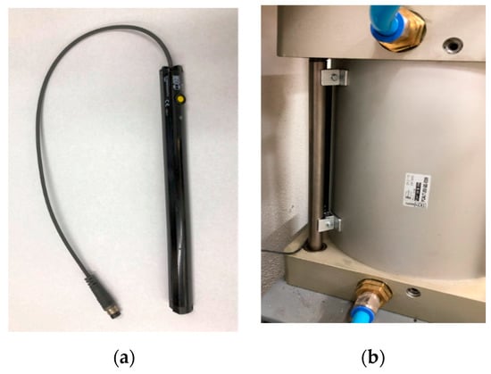 (a) Non-contact displacement sensor, (b) and in the mounted state next to the cylinder.