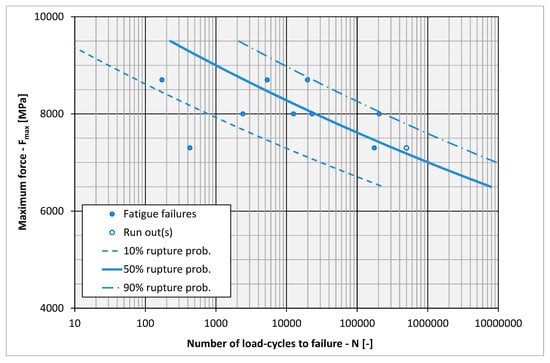 A total of ten fatigue-life tests were performed at three load levels of force F: 8700 N, 8000 N and 7300 N (see Figure 18). Nine tests resulted in fatigue failures and the terminal value of 500,000 load cycles was reached in one test at the lowest load level.