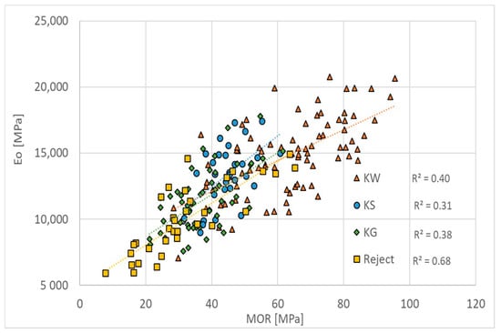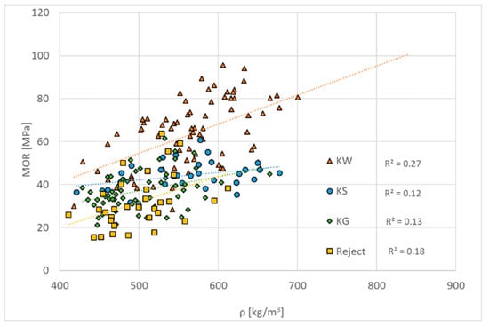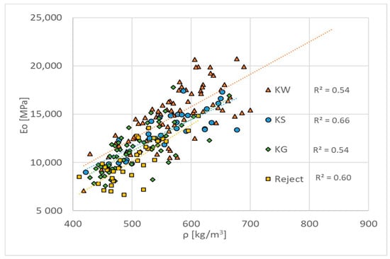 Figure 1 presents the correlations between the modulus of elasticity parallel to the grain and wood density (the values were corrected according to the guidelines from EN 384). The coefficient of determination for the entire timber batch (210 pieces) amounted to 0.31. This value was significantly lower than the coefficient of determination between the modulus of elasticity and density determined in a previous study of 764 pieces of Scots pine timber from various Polish forestry regions, which amounted to 0.43 []. In a case of Finnish pine timber, the coefficient of determination between the modulus of elasticity parallel to the grain and wood density amounted to 0.54 []. In turn, studies of Scots pine timber pieces with different cross-section dimensions have shown that the coefficient of determination between the modulus of elasticity parallel to the grain and static bending strength can fall in the range between 0.49 and 0.66 []. Taking the division of timber into strength grades (KW, KS, KG, and Reject) into account, the highest value of coefficient of determination (0.66) was obtained for timber from the KS grade. The coefficient was lower for both KW and KG grades (0.54), while the Reject grade had a coefficient of determination of 0.60. These values were clearly higher than the values obtained in a previous study of Polish-grown timber from five different forestry regions. The coefficients of determination obtained in that study were 0.59 for KW, 0.50 for KS, 0.52 for KG, and 0.48 for Reject [].