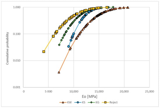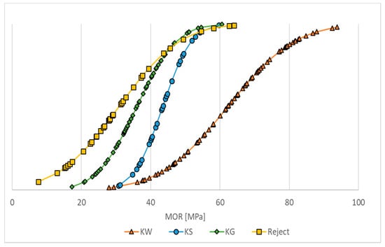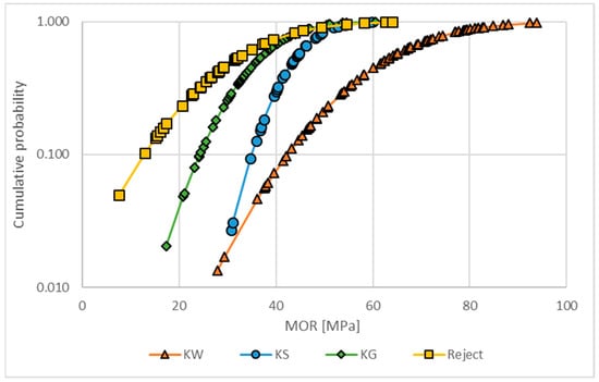 Figure 4 presents the cumulative strength distributions for each strength grade of timber. Considering that the cumulative strength distribution makes it difficult to analyze the results in the lower and upper part of the curve, Figure 5 and Figure 6 present the values of the cumulative probability of the occurrence of each property (static bending strength and the modulus of elasticity parallel to the grain) in a logarithmic scale. An analysis of the curves presented in Figure 5 and Figure 6 allows one to notice a typical shift of strength distributions (MOR and E0) of timber classified into different grades (KW, KS, KG, and Reject). Higher values of the parameters (MOR and E0) were achieved by timber classified in higher strength grades as a result of the visual strength grading process. Figure 5 and Figure 6 show a clear, typical, and high variance of the parameter within a given strength grade. This variance can be reduced by a more careful selection of research material, as well as by sub-dividing strength grades into smaller sub-grades [,]. Another possibility consists of improving the sorting methods, especially by preparing models that would provide higher correlations between the physico-mechanical properties of timber and timber strength grades.