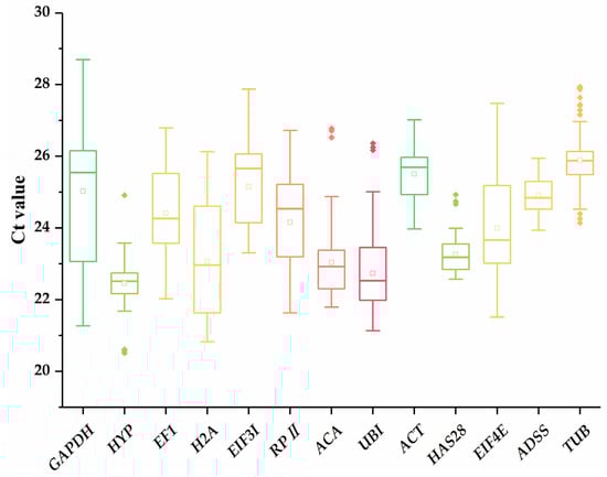cycle threshold (Ct) values of thirteen candidate reference genes in G. biloba samples. The whiskers, boxes, lines, boxes, and hollow and solid dots represent maximums/minimums, 25th/75th percentiles, medians, means, Ct values, and potential outliers. The different color lines have no practical meaning.