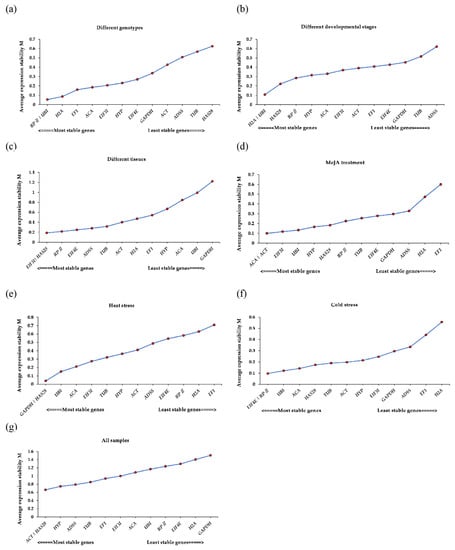 The stability values (Ms) of thirteen reference genes under different experimental conditions according to geNorm. (a) Different genotypes, (b) different developmental stages, (c) different tissues, (d) Methyl Jasmonate (MeJA) treatment, (e) heat stress, (f) cold stress, and (g) all samples.