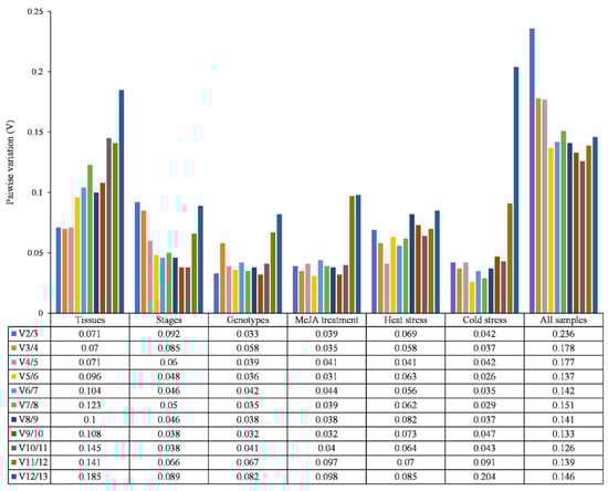 The geNorm algorithm was used to evaluate the stability values (Ms) of reference genes and calculate the average pairwise variations (Vs) to determine the optimal number of internal reference genes. According to the geNorm program, only candidate genes with an M value lower than 1.5 could be selected as suitable reference genes. The smaller the M value is, the higher the expression stability of the candidate reference gene. Most genes were stable, with M values lower than 1.5 (Figure 2). Our results showed that RPII and UBI had the smallest M values (0.054), so these two genes were the most stable in the different genotypes, while HAS28 was the least stable (0.625) (Figure 2a). At the different developmental stages, H2A and UBI with an M value of 0.107 were the most suitable genes, while ADSS with the highest M value (0.621) was the most unsuitable (Figure 2b). EIF3I and HAS28 were indicated as the most suitable genes in the different tissues, but the common internal reference gene GAPDH was considered as the least suitable (Figure 2c). ACT and ACA (0.099) were identified as the most stably expressed reference genes for MeJA treatment (Figure 2d). After heat stress treatment, GAPDH and HAS28 (0.04) were the most suitable genes with a stability value of 0.04 (Figure 2e). For the above treatments, EF1 was the most unstable gene. Within the cold stress group, EIF4E and RPII (M = 0.097) were the most suitable genes, and H2A (0.557) ranked last (Figure 2f). ACT and HAS28, reflecting the highest stability, were the optimal reference genes, while GAPDH was also the worst choice in all the samples (Figure 2g). On the basis of our results, we found that the most appropriate genes under various experimental conditions were different.