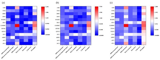 The value of the standard deviation (SD) was used as the indicator for evaluating the expression stability of reference genes. A reference gene with a lower SD value is more stable (Figure 4c and Supplementary Table S5). In the groups of different genotypes, developmental stages, and tissues, UBI, HYP, and EIF3I presented the most stable expression, while HAS28, ADSS, and GAPDH presented the least stable expression. In the MeJA, cold stress, and heat stress treatment groups, ACA, UBI, and HAS28 were the most appropriate reference genes. EF1 was the worst in both the MeJA treatment and heat stress groups. For cold stress, H2A was the worst choice. These results were the same as the results obtained with the geNorm, NormFinder, and BestKeeper analyses.