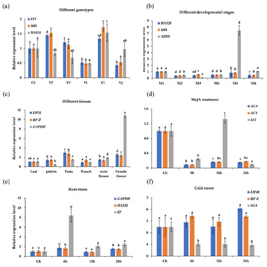 Relative expression levels of the GbCHS target gene in all samples under different experimental conditions. In each bar chart, the blue and orange bars represent the two best reference genes, and the grey bars represent the worst. (a) Different genotypes, (b) different developmental stages: M1–M6 represent May, June, July, August, September, and October respectively, (c) different tissues, (d) MeJA treatment, (e) heat stress, and (f) cold stress. CK means control. The error bars and different letters above the bars indicate the standard deviations (SDs) and significant differences (p < 0.05).