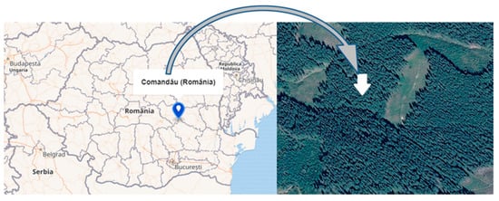 The tree stand with western aspect is located in the Eastern Carpathians, part of the Curvature Carpathians at a latitude of 45°45′23.83″ N and a longitude of 26°23′37.32″ E. The altitude is between 1300 and 1400 m, with a land slope of 18° (Figure 1). The tree stand is part of the Forest District of Comandău, forest management unit 93A.