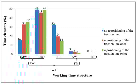 - 2.552 m3·h−1 or 1.402 trees·h−1 (tree volume was 1.820 m3) for the one tree that needed the TL to be repositioned twice. WT structure according to time elements is presented in Figure 5.