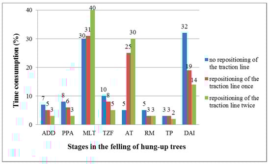 WT consumption in the felling of hung up trees according to stages is presented in Figure 6.