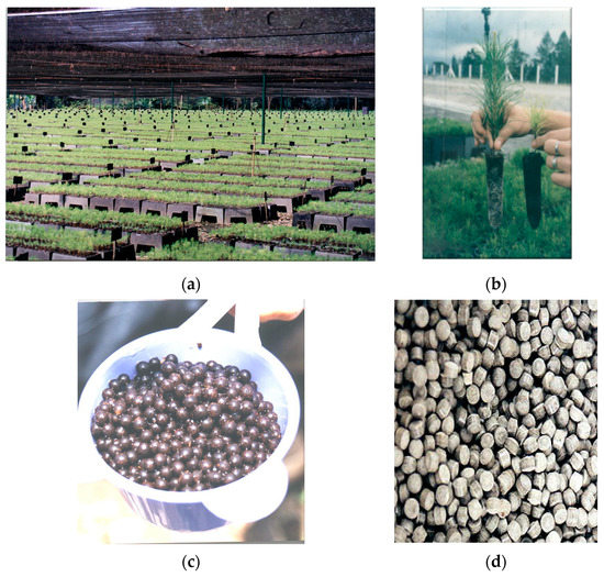 Some industrial plantation companies in Indonesia have been producing Sumatran pine seedlings on a mass scale by adopting modern nurseries [70]. The modern nursery applied Standard Operating Procedures (SOP) in their practice that involve container, growing media, sowing, irrigation, fertilization, weed control, pathogen, insects, lifting, packing, and shipping [71]. Sumatran pine is one of the major important trees, thus establishing modern nurseries is critical in growing good-quality Sumatran pine seedlings. A recent technology uses reusable poly tube container (size 100 g) with mixed peat-compost media, inoculated with microbial symbiosis and the addition of slow-release fertilizers (SRF) that provide seedlings with nutrient released for 4–6 months. Misting, automatic watering system, and layered hardening area are also available in the modern nursery. This innovative technology is very important to increase the sustainability of the management of Sumatran pine plantations in Indonesia (Figure 2) [72].