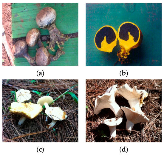 Ectomycorrhizas (ECM) are dual structure bodies between the terminal feeder roots of forest tree species and certain forest fungi [73]. All tropical forest trees depend on the advantageous symbiosis between forest fungi for absorption water and macro and micro-nutrient from forest soils. In this way, ECM fungal mantel can protect the root of the seedlings from fungal pathogen [74]. This symbiosis is important for the mass production of seedlings in the reforestation program; serving as sustainable forest management in an industrial forest plantation, Sumatran pine has a very strong ECM fungal symbiosis relationship. Various families of ECM symbiotic with pine trees have been reported in Thailand and Indonesia. Two pine tree species (P. merkusii and P. kesiya) are native species growing in a mountain and dryland in Thailand. They showed a high relationship with the occurrence of ECM fruit bodies of Amanita, Boletus, Inocybe, Laccaria, Lactarius, Russula, Thelephora, and Scleroderma [75]. There are also various genera of ECM fruit body found at Sumatran pine stands in Indonesia, such as Amanita, Astraeus, Russula, Lactarius, Boletus, Suillus, Lepiota, Thelepora, Scleroderma, and Pisolithus in its natural habitat of Aceh [70,76], Suillus granulatus and S. placidus and Hemioporus retisporus (Boletaceae) in mature Sumatran pine plantation [77,78], and H. retisporus in heath forests ecosystem under Tristaniopsis spp. in Bangka Island (Figure 3) [79].