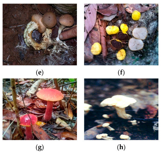 Fruit bodies of ECM fungi recorded in association with Sumatran pine plantation in Java Island, such as (a) Pisolithus arhizus, (b) Scleroderma sinammariense, (c) Suillus sp., (d) Lactarius sp., (e) Scleroderma columnare, (f) Rhizopogon sp., (g) Hemioporus retisporus, (h) Chantarellus sp.