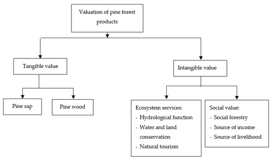 Sumatran pine provides tangible and non-tangible multiple benefits for the human being. In terms of its tangible benefit, the pine produces non-timber forest products such as resin or pine resin, as well as wood forest products. Meanwhile, the intangible benefit is provided in the form of environmental services such as pine forests as a nature tourism location, land and water protection services, and hydrological function [22,35,109,110]. In addition, the Sumatran pine forest also provides social benefits for people residing near the forest. Through the social forestry program, the pine forest is allocated to be managed by the community. The community is given access to manage the state forests with a shared revenue mechanism. This shows that Sumatran pine forests in Indonesia provide multiple benefits that are very important for human welfare, as shown in Figure 4 (Figure 5).