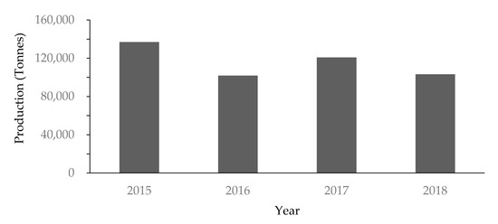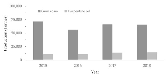 Perhutani noted that the production of pine resin is now becoming a mainstay of Perhutani’s revenue apart from timber products. Based on Reference [116], the contribution of revenue from gum rosin and turpentine oil to Perhutani’s total income is quite large, reaching around 45%. Perhutani has eight gum rosin and turpentine processing plants with a total production capacity of 92,550 tons spreading across Central Java, East Java, and West Java. The average area of pine sap tapping in the Perhutani area from 2015 to 2018 was 1,635,375 ha per year with an average level of pine resin production of 90,422 tons per year. With an average yield of 71% for processing pine resin into gum rosin and 19% for turpentine oil, gum rosin and turpentine oil production volumes from 2015 to 2018 are shown in Figure 7.