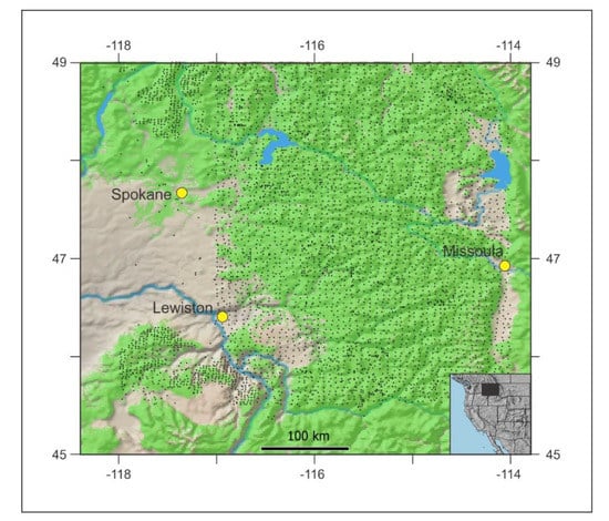 Forested lands of the Thuja-Tsuga ecosystem (green shading) of the inland Northwest USA with dots locating forest inventory’s permanent sample plots.