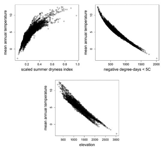 (top left) Scatter plot relating the summer dryness index to mean annual temperature. (top right) Scatter plot relating negative degree-days to mean annual temperature. (bottom) Scatter plot relating elevation to mean annual temperature. Climate data are modeled climate estimates for the ca. 5100 ground plots of Figure 1 that were used in the analyses of Rehfeldt et al. [].