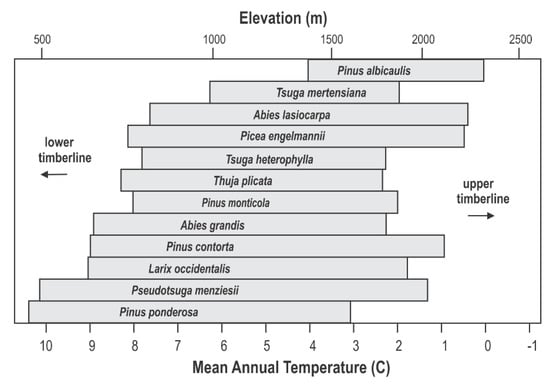 Ordination of 12 conifer species of Figure 2 according to mean annual temperature and elevation for USA’s inland northwest.