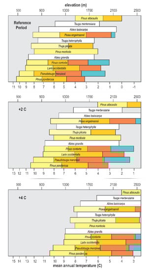 We describe potential impacts on the current generation of forests and project them for future generations as a response to temperature increase. For each 2 °C warming, climatic niche of 12 species are projected to shift upwards in elevation by about 400 m. Yet, we treat the species assemblage as reacting to the same climate variables when, in fact, plant associations did not respond as a unit to the Pleistocene climate changes [,]. It is well established that species respond individualistically to changes in climate. Our position is that if the reference period and future climates are analogous, then species and climatypes adapted to reference period climates will be adapted to the same climate in the future.