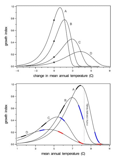 (top) Response of four climatyes (lines) of Pinus contorta to change in temperature. Dots show the growth expected at the home provenance having, therefore, a climate change of zero. Lines labeled A to D depict climatypes from lowest to highest elevation. (bottom) Response of the same four climatypes to mean annual temperature. Thickened portion of response functions shows growth of climatypes at the temperature of their home (black), +2 °C (blue), and +4 °C (red). Niche climate limits are based on ground plot data. Both panels are redrawn from Rehfeldt et al. [].