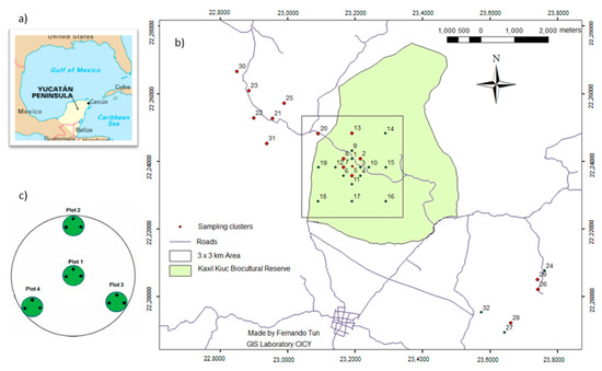 The study area is located in Kaxil Kiuic Biocultural Reserve and its surroundings (20°5′ 20°7′ N; 89°32′ 89°34′ W), at the central part of the Yucatán Peninsula (Figure 1a). The reserve stretches across 1800 ha, mostly covered by semi-deciduous tropical dry forest.