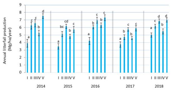 Litterfall production varied significantly among successional age classes over the entire study period (F = 49.863, p < 0.001) (Table 2), as well as within years (F ≥ 12.595, p < 0.001 in all study years) (Figure 2). Although litterfall production varied widely among years, the lowest values were consistently recorded in forest age class I (3–5 years), whereas the highest values were observed in forest age class III (18–25 years) and/or V (≥80 years) (Figure 2).