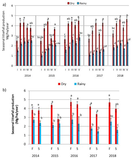 Litterfall production was consistently higher in the dry than in the rainy season in the five years across the different successional age classes (Figure 3a) and in the two topographic positions considered, except for sloping sites in 2015 (Figure 3b). There were significant interaction effects between seasons and age classes (F ≥ 5.906; p < 0.001 in all study years) as successional patterns differed between seasons (Figure 3a) but not between seasons and topographic positions (F = 0.336; p ≥ 0.173 in all years), except for 2015 (F = 30.975; p < 0.001) (Figure 3b).